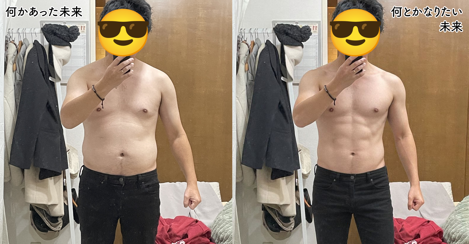 左がわがままボディ。右がアイアンボディです。Photoshopは何でもできますね。男に生まれたからには一度は搭載してみたい腹筋6LDK、カモシカのような脚、膝みたいな大胸筋。